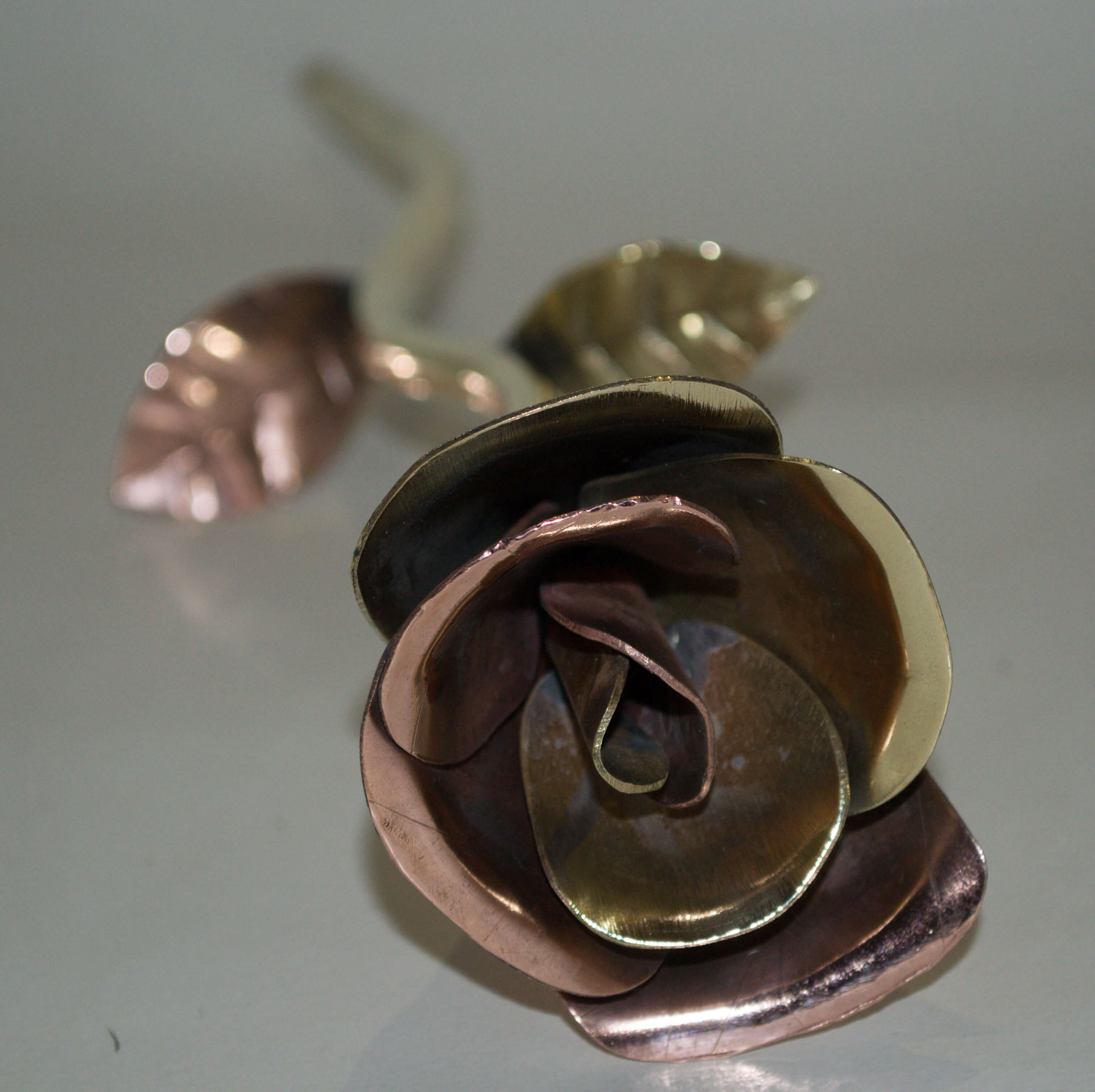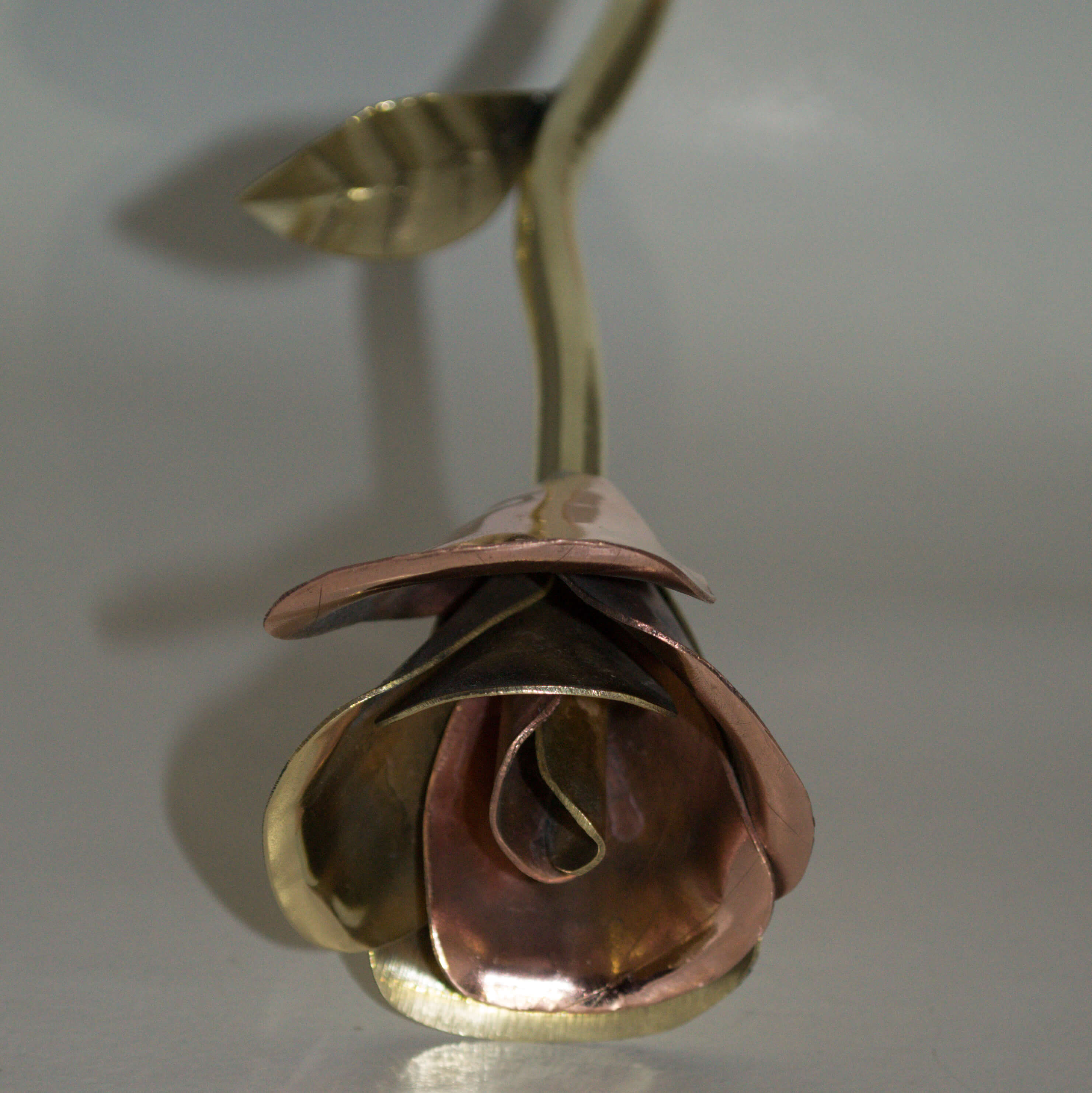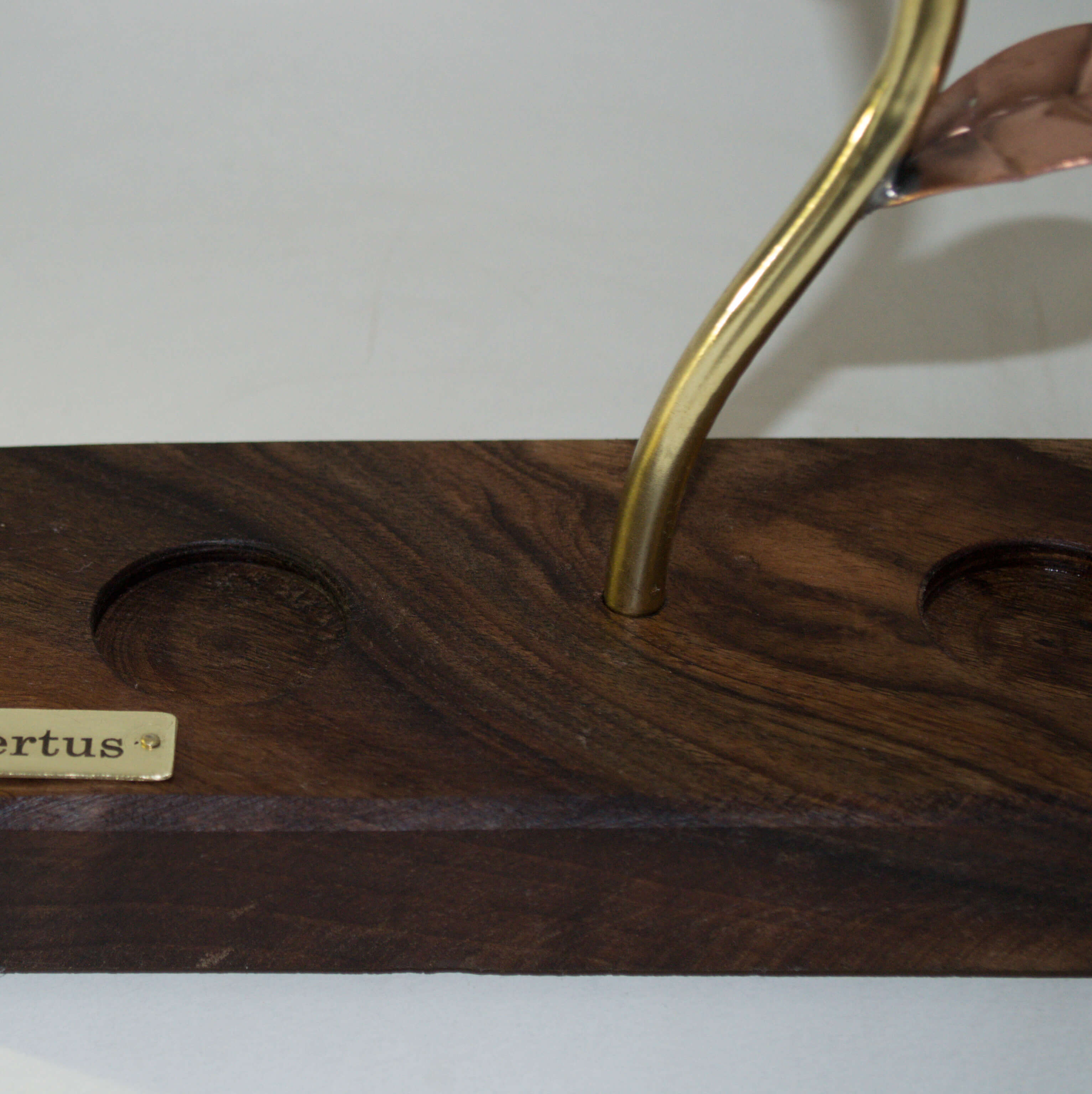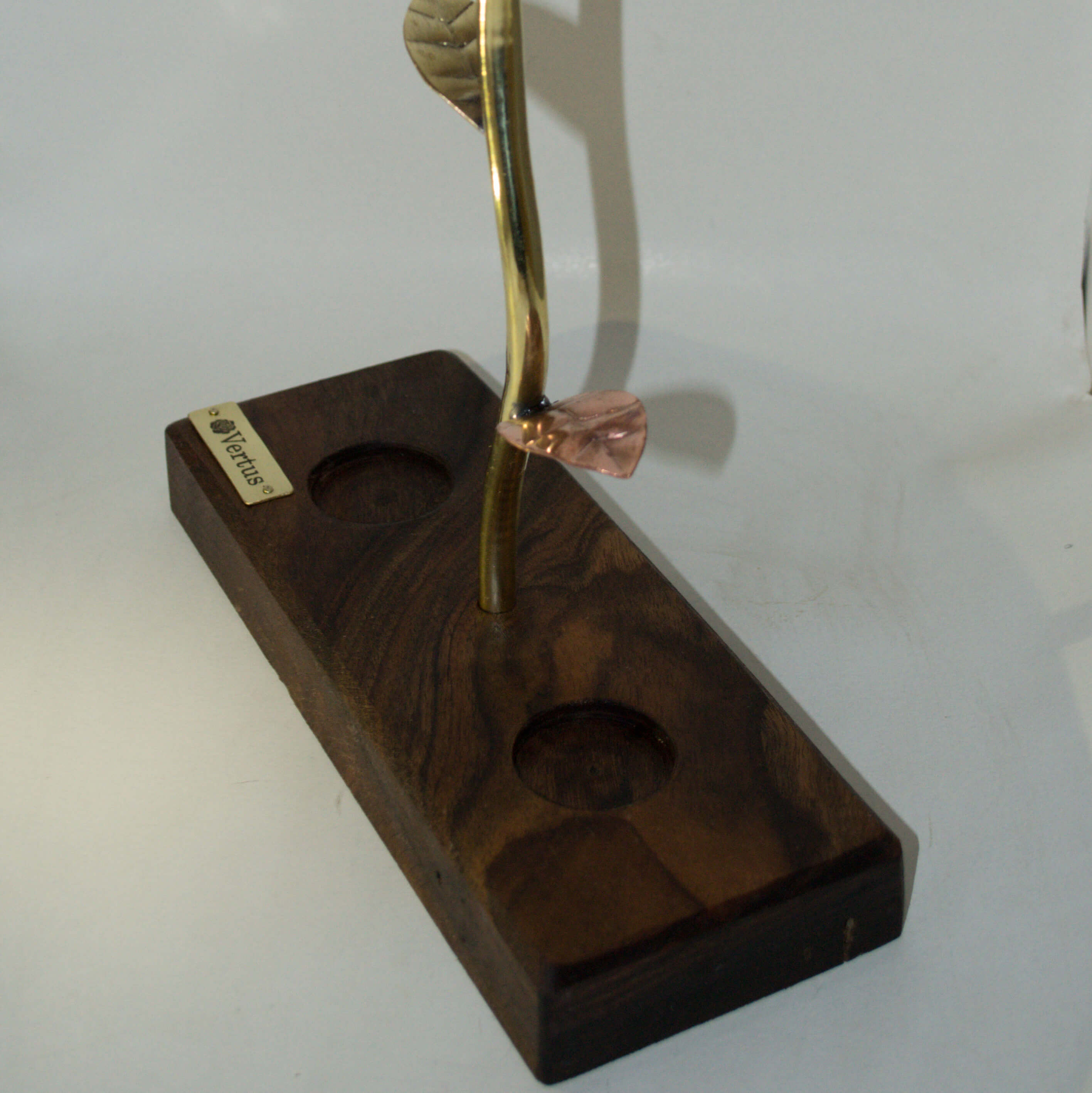 Handmade essential oil holder featuring a brass rose sculpture on a dark walnut wood base. Designed with two circular slots to hold rose oil or essential oil bottles. This elegant piece blends art and function, perfect for aromatherapy lovers, spa settings, or natural skincare displays. A unique floral-themed decor item and a thoughtful gift idea.