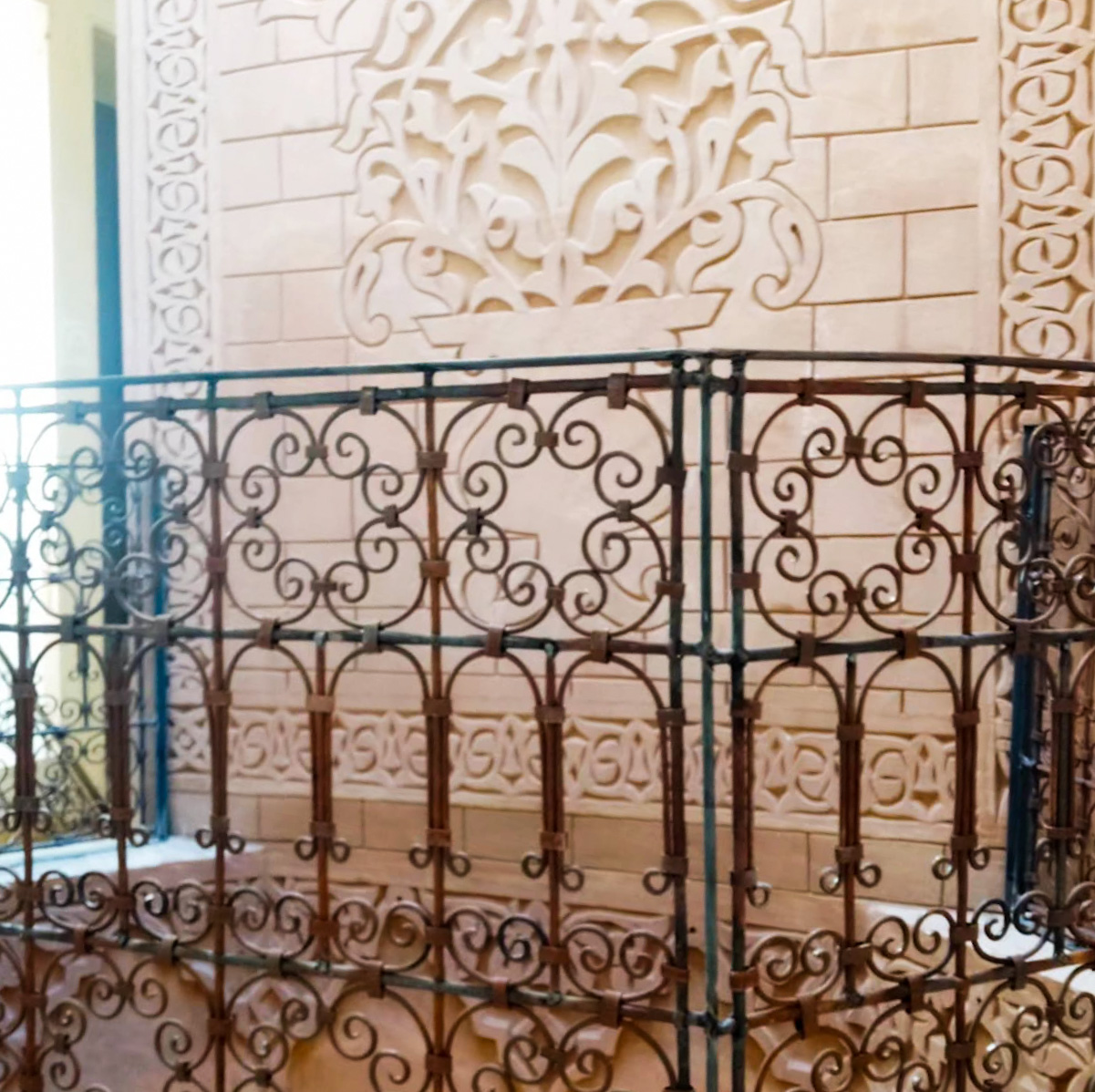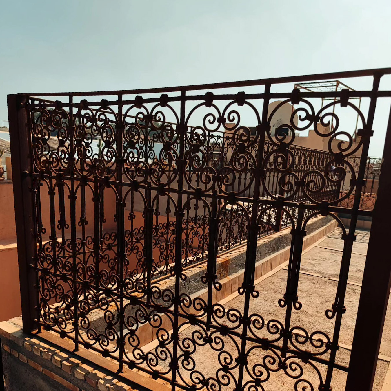 This piece is a beautifully handcrafted wrought iron railing, designed with intricate scrolls and symmetrical patterns inspired by traditional Moroccan art. It combines durability with elegance, serving both as a safety feature and a decorative element for staircases, balconies, or terraces. The detailed craftsmanship highlights the beauty of metalwork, adding a timeless and artistic touch to any space.