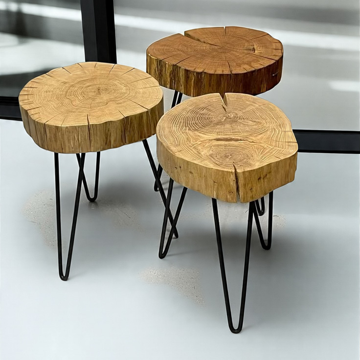 This elegant set handcrafted side tables combines natural wood slices with modern black metal legs. Each tabletop is made from solid tree trunk cross-sections, showcasing unique grain patterns and organic cracks that add character and authenticity. The minimalist hairpin legs provide a modern contrast to the raw wood, creating a perfect blend of rustic charm and contemporary design. Ideal as accent tables in living rooms, lounges, or creative spaces.